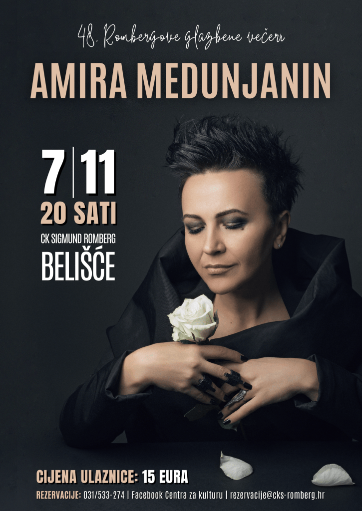 Preuzimanje rezerviranih ulaznica za koncert Amire Medunjanin je najkasnije do 5. studenog 2025. godine u Centru za kulturu Sigmund Romberg svakog radnog dana od 7 do 15 sati.