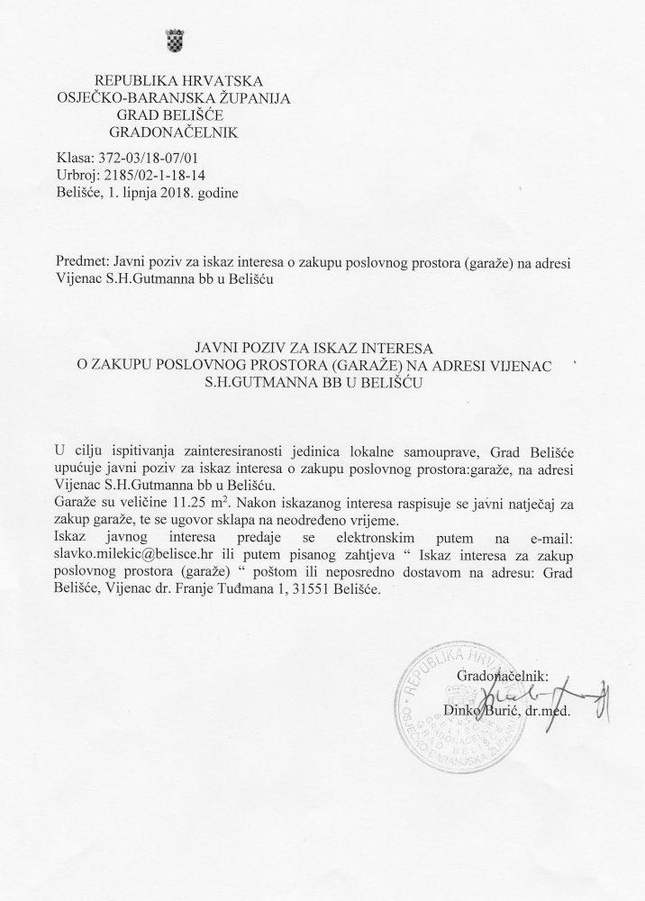 U cilju ispitivanja zainteresiranosti jedinica lokalne samouprave, Grad Belišće upućuje javni poziv za iskaz interesa o zakupu poslovnog prostora: garaže, na adresi Vijenac S.H.Gutmanna bb u Belišću.