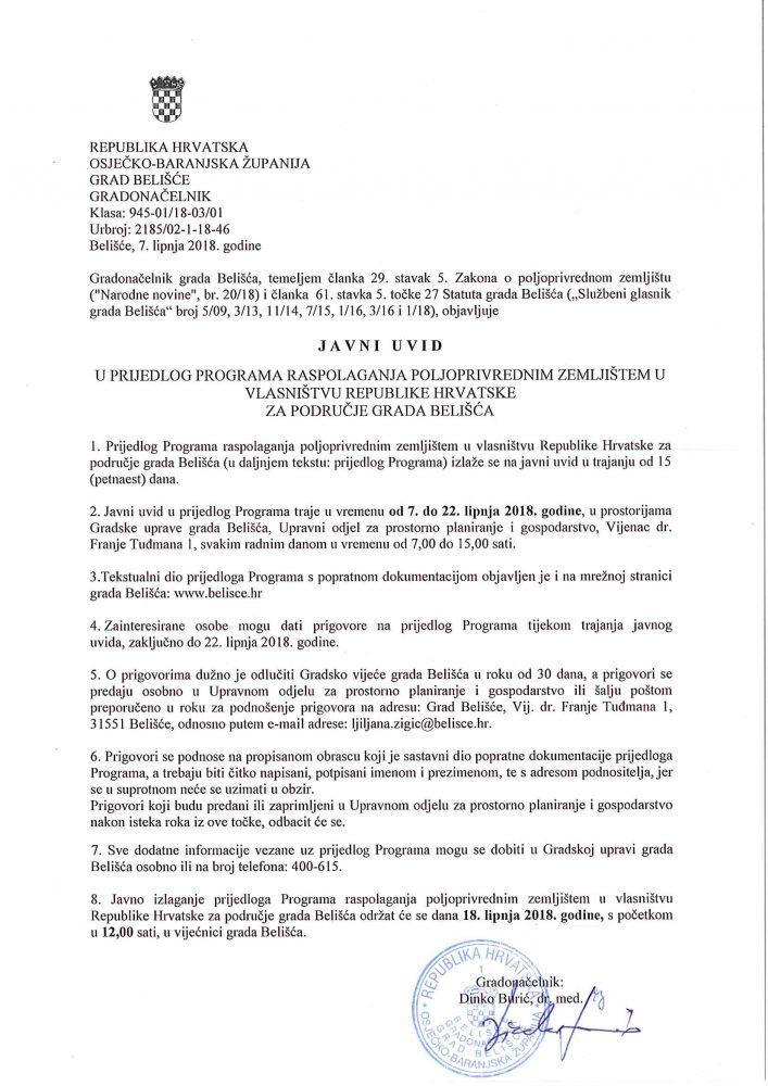 JAVNI UVID u prijedlog Programa raspolaganja poljoprivrednim zemljištem u vlasništvu Republike Hrvatske za područje grada Belišća