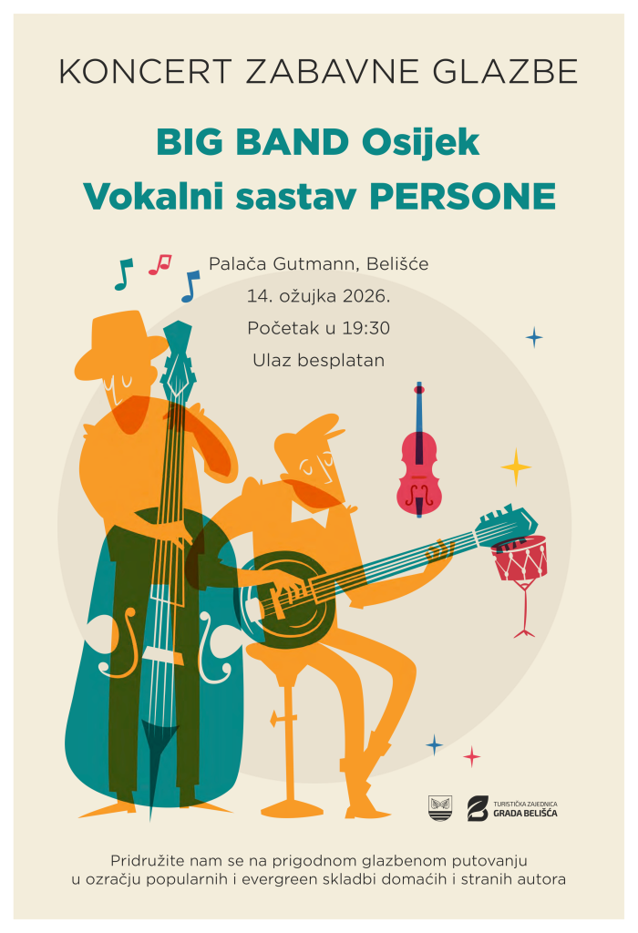 U Palači Gutmann u Belišću u subotu, 14. ožujka 2026. godine, održat će se koncert koncert ženskog vokalnog sastava Persone i Big Banda Osijek.
