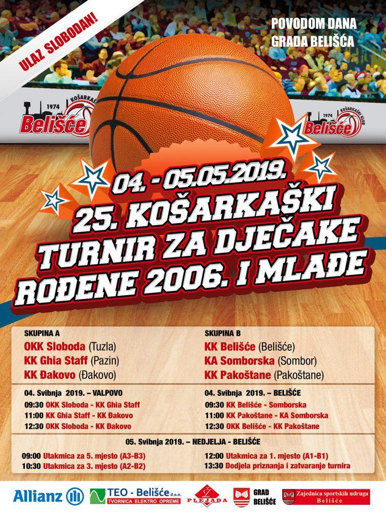 Jubilarni 25. košarkaški turnir povodom dana grada Belišća održat će se 4. i 5. svibnja 2019. godine. Turnir je međunarodnog karaktera. Sudjeluju šest ekipa: ekipe OKK Sloboda iz Tuzle, KA Somborska iz Sombora, KK Ghia Staff iz Pazina, KK Pakoštane iz Pakoštana, KK Đakovo i KK Belišće. Turnir će se održati u dvorani u Belišću – grupa B, te u dvorani u Valpovu – grupa A, a termine možete vidjeti na plakatu.