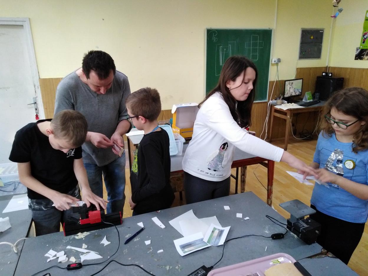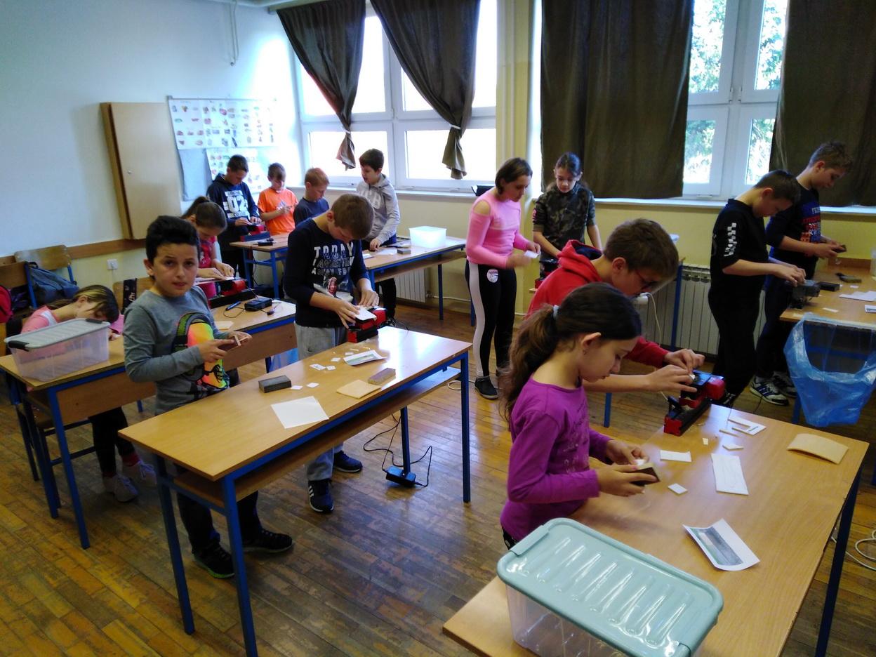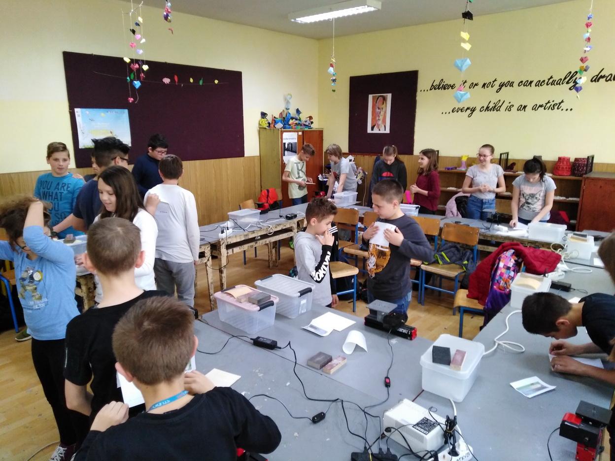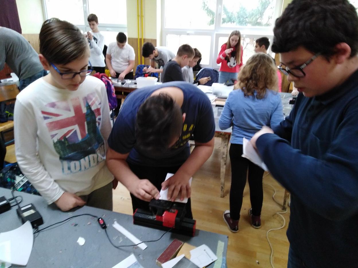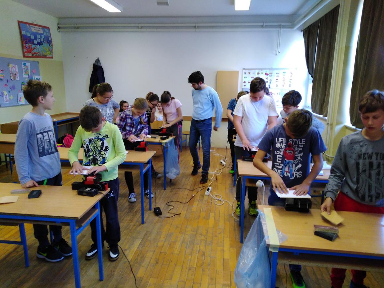 Ponedjeljak 15. travnja bio je za većinu učenika petih razreda OŠ Belišće ulazak u svijet modelarstva. Zahvaljujući nastavniku tehničke kulture Velimiru Kunzinamu gosti iz ZTK Valpovo-Belišće, Ivana i Dragan, postavili su u učionici tehničkog 13 Unimat strojeva za piljenje šperploče. Nakon uvodnih pojašnjenja o načinu rada i modelu kolica koji trebaju izrezati, finalno obraditi i polijepiti, započelo je brujanje strojeva. U radionicama su sudjelovali i pojedini učenici sedmih razreda. U početku je bilo pregršt pitanja ali nakon desetak minuta mali su majstori savladali rad na stroju. Ekipu su činila dva učenika koja su morala biti kao “prst i nokat” kako bi uradak bio na vrijeme i dobro napravljen. Na kraju su svi uspjeli završiti tehničku tvorevinu.