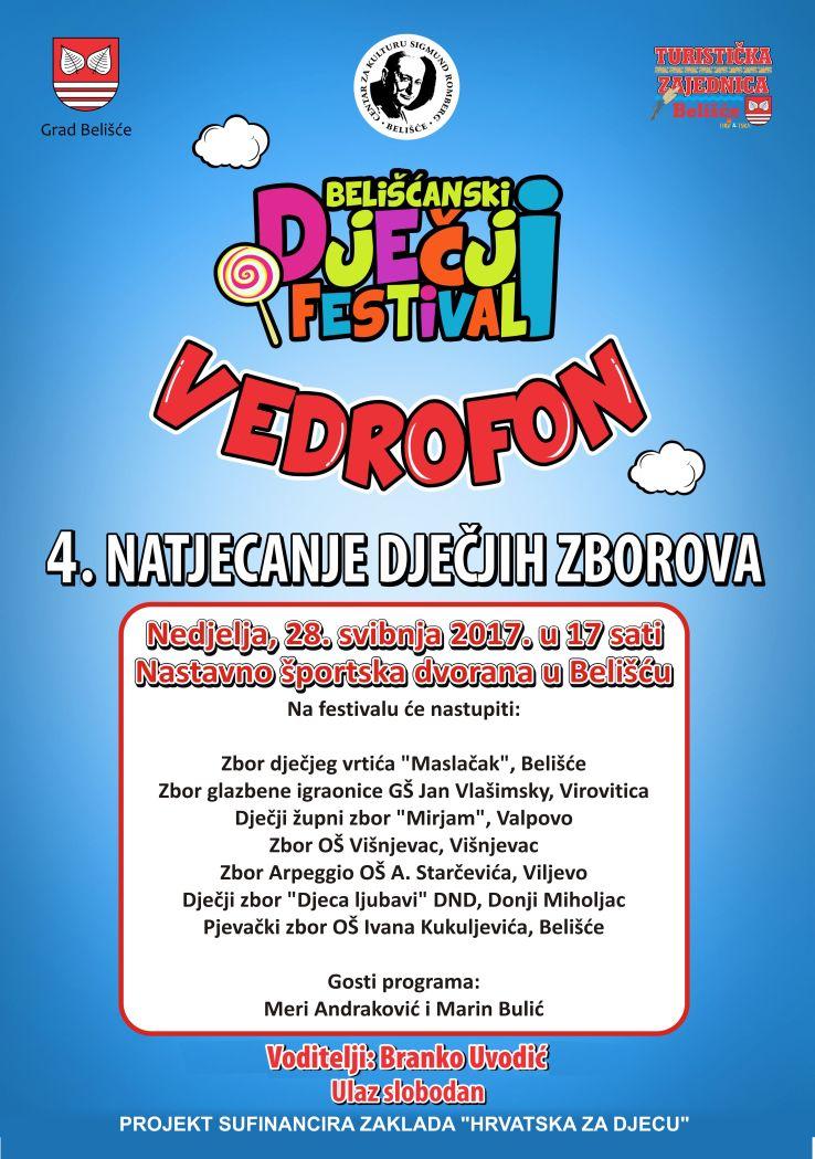 Organizatori pozivaju sve ljubitelje dječje pjesme, zainteresiranu djecu, učenike, roditelje, bake, djedove i sve građane na 4. belišćanski dječji festival Vedrofon koji će se održati u nedjelju, 28. svibnja 2017. godine s početkom u 17 sati, u nastavno-sportskoj dvorani OŠ Ivana Kukuljevića u Belišću. Natjecat će se sedam zborova, voditelj programa bit će Branko Uvodić, a na festivalu će nastupiti i mlade pjevačke zvijezde Meri Andraković i Marin Bulić.
