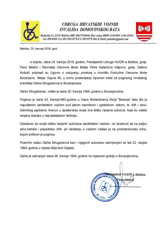 U srijedu, dana 24. travnja 2019. godine, Predsjednik Udruge HVIDR-a Belišće, gosp. Pavo Milekić i Ravnatelj Osnovne škole Matije Petra Katančića Valpovo, gosp. Dalibor Košutić potpisali su Ugovor o ustupanju prostora u dvorištu Područne Osnovne škole Bocanjevci, Matije Gupca 49. u svrhu postavljanja Spomen biste za poginuloga hrvatskog branitelja Darka Strugačevca iz Bocanjevaca.